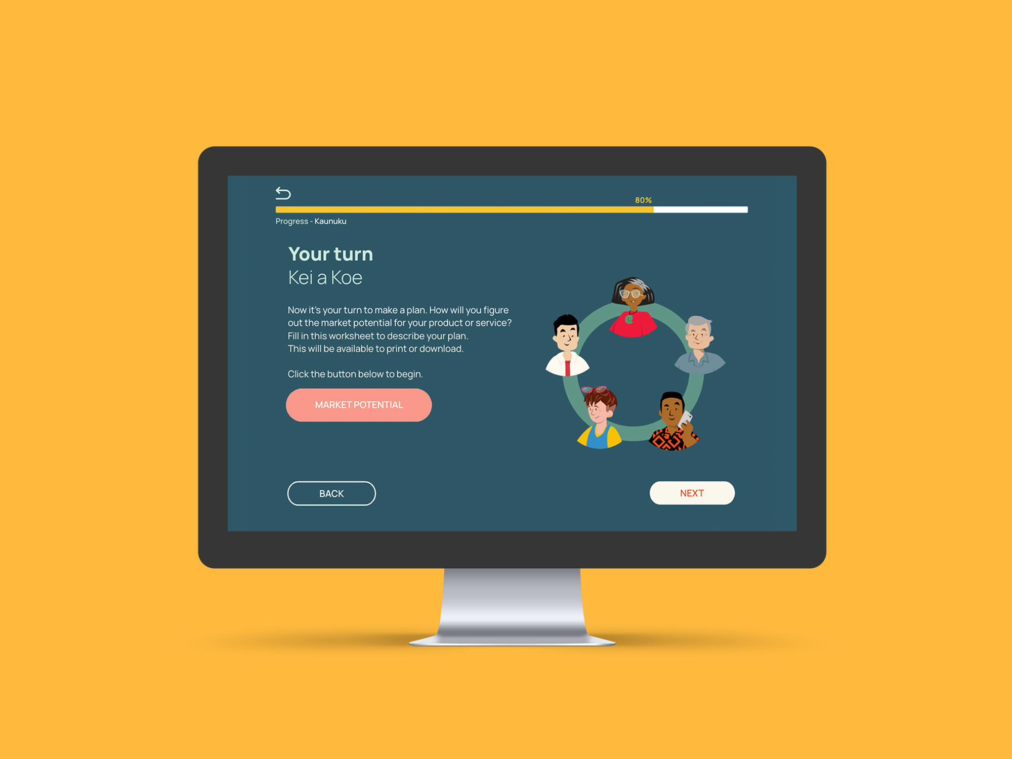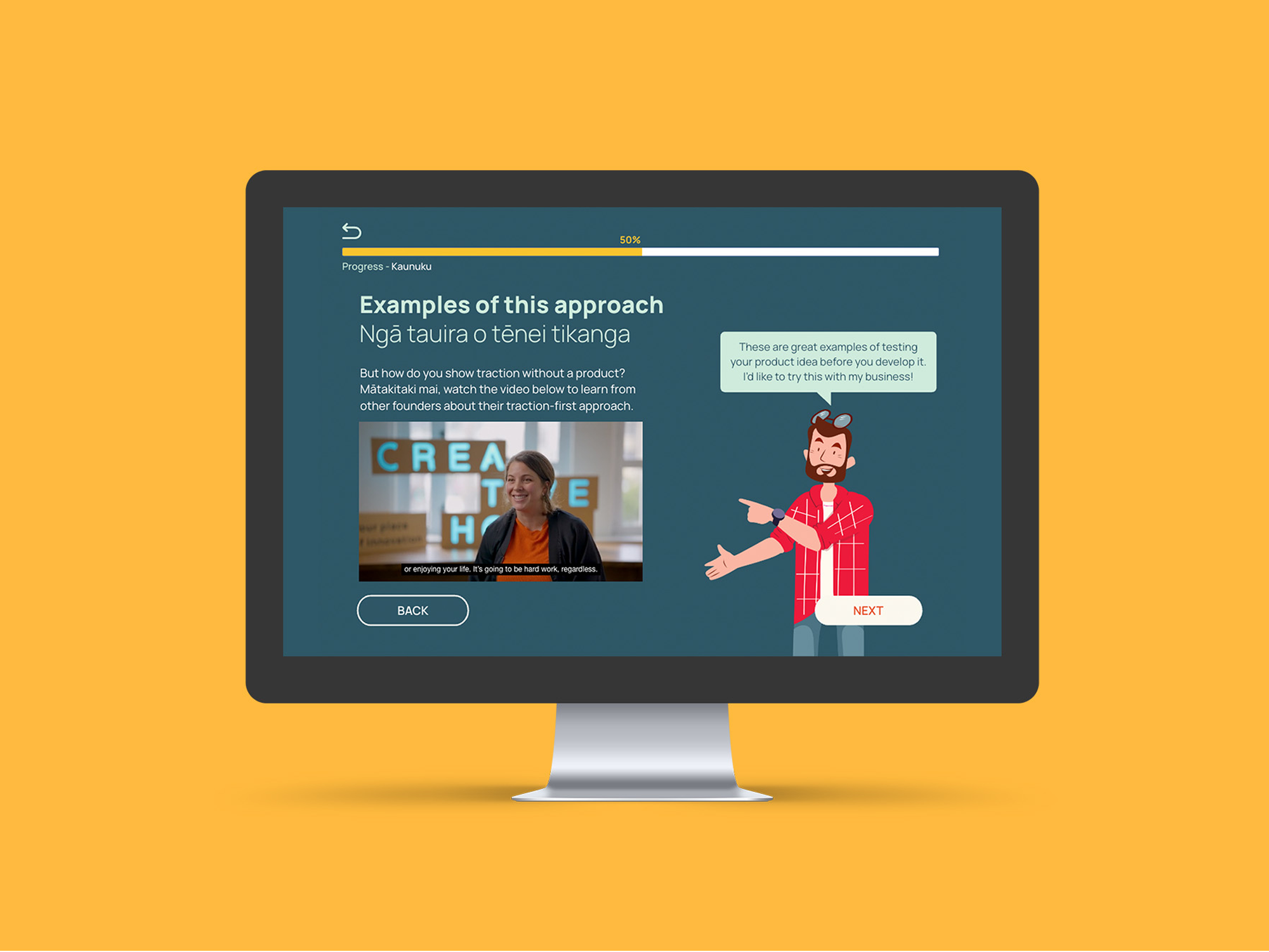 We developed the content for the modules collaboratively with the client, and used video interviews with successful Kiwi founders to explain key concepts. We developed two animated characters who accompany founders throughout their learning journey and help them complete the various activities.